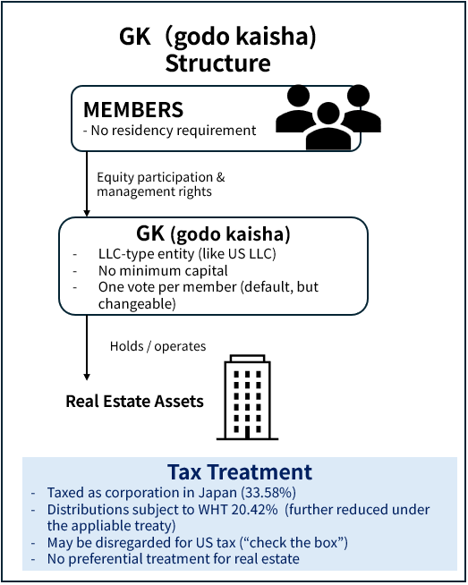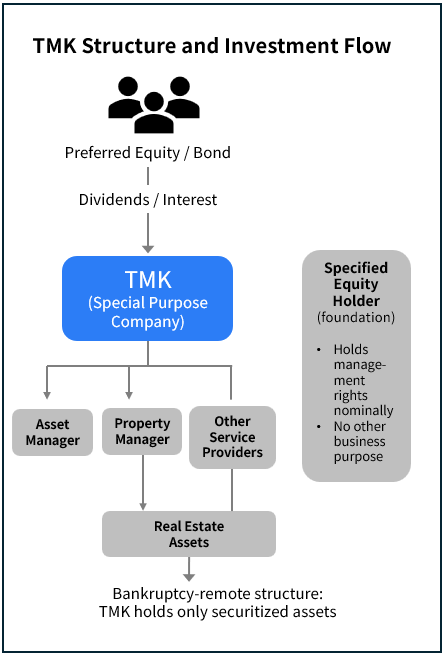 | Tokutei Mokuteki Kaisha (TMK) | Regulated SPC, requires FSA filing | Dividend deduction possible; 20.42% WHT (treaty reduction possible); BEPS restrictions | Corporate tax can be minimized | Heavy regulation and costs |