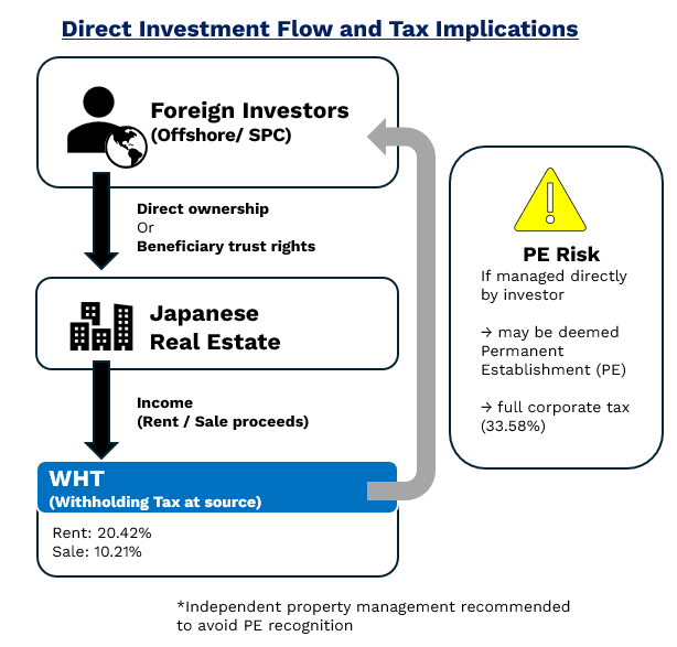 | Direct Investment | No Japanese vehicle required | Withholding tax on rental income and capital gains; PE risk if not managed externally | Simple, no setup cost | Investor directly liable for Japanese tax |